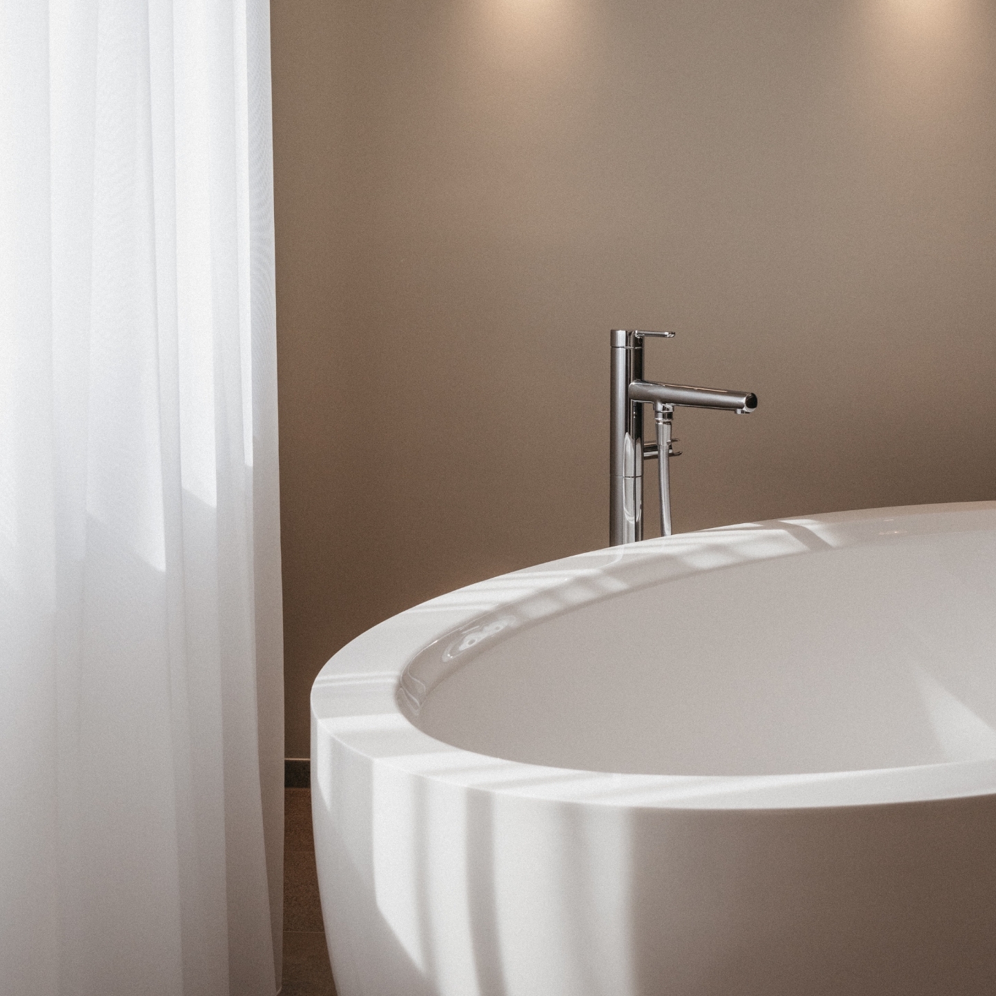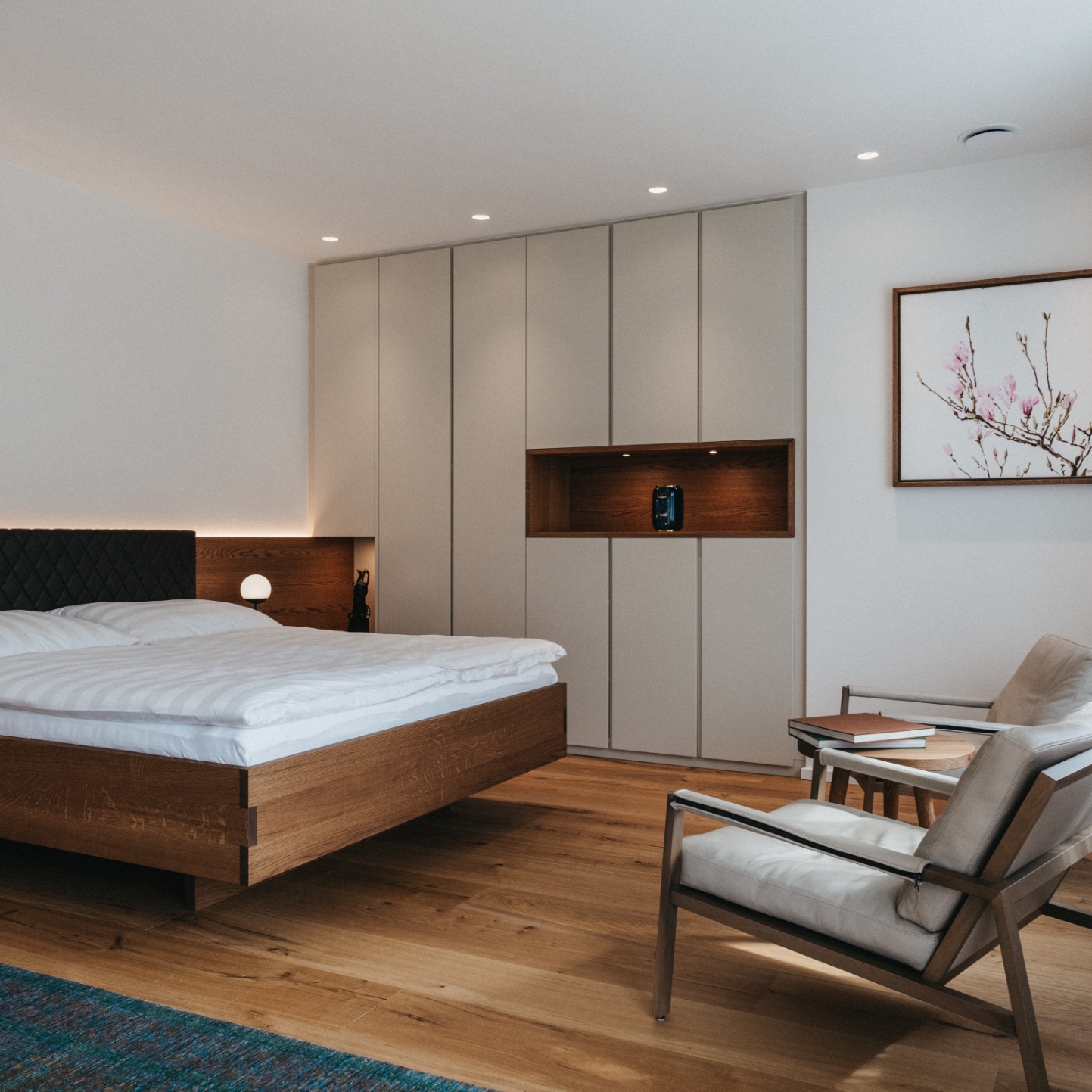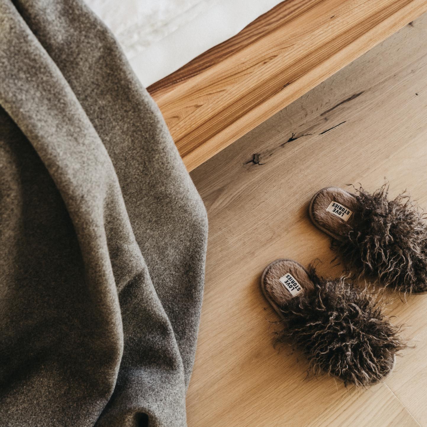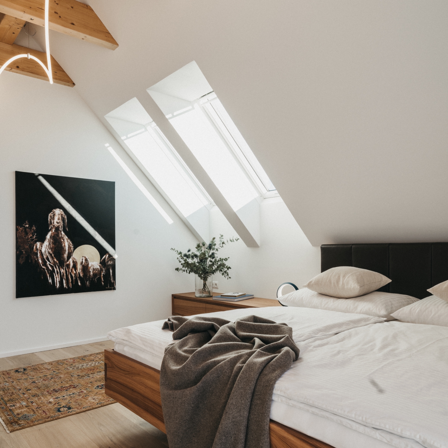 Im Geschoss darunter befindet sich der Schlaf- und Wellnessbereich mit freistehender Badewanne, Dusche und WC. Zusätzlich kann hier im Arbeitsraum ein zweites Schlafzimmer für bis zu zwei Personen eingerichtet werden.