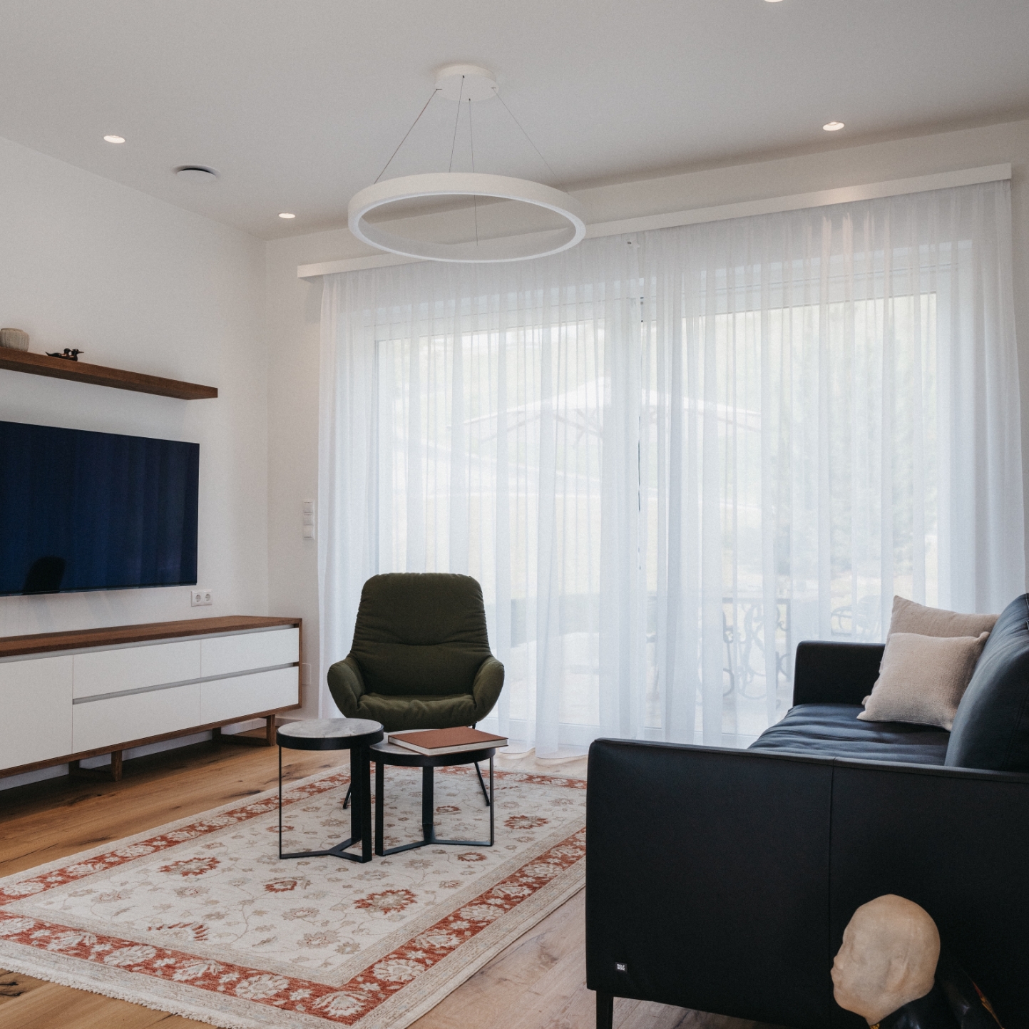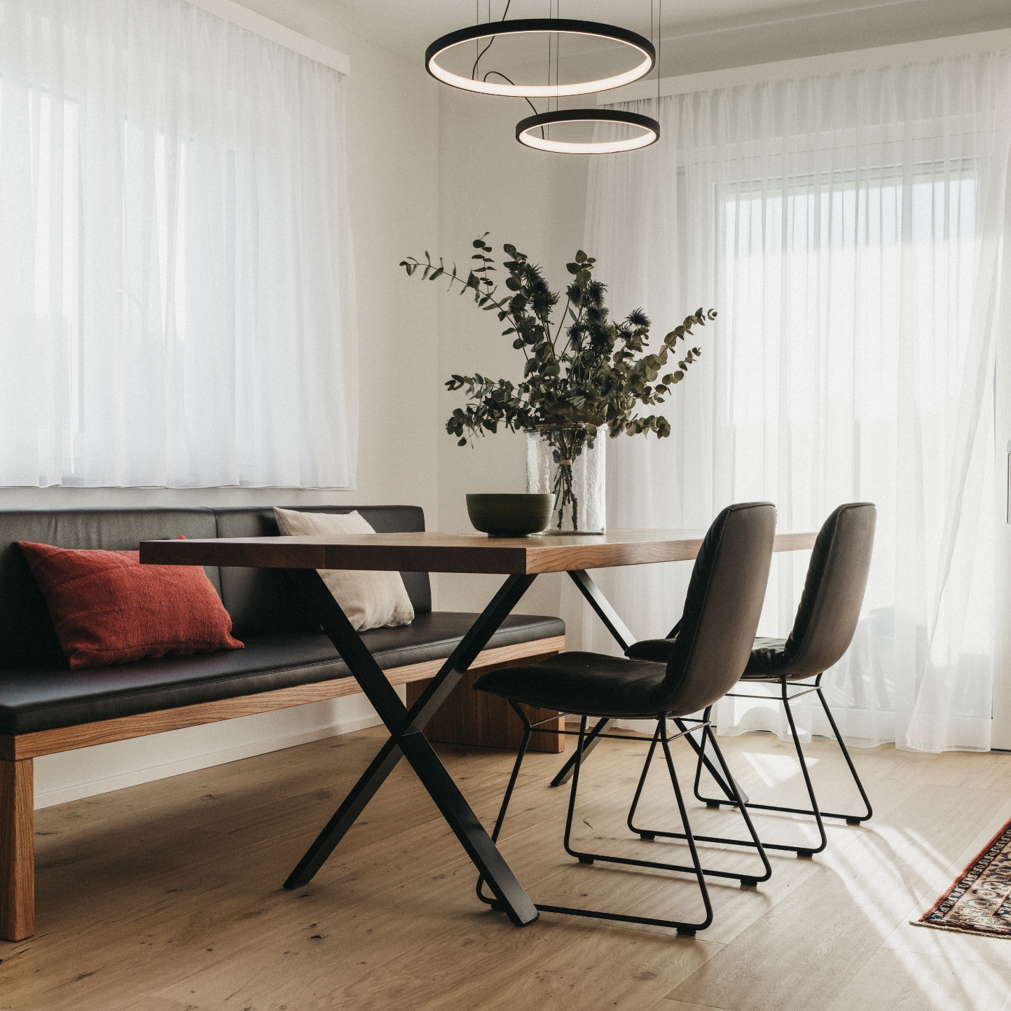 Die modern gestalteten Räume im Erd- und Dachgeschoss bieten viel Platz, erstklassigen Wohnkomfort und ein Ambiente, das zum entspannen einlädt. Im direkt angrenzenden Holzriegelbau befinden sich eine wunderschöne Sauna (klafs) und ein Yogabereich.